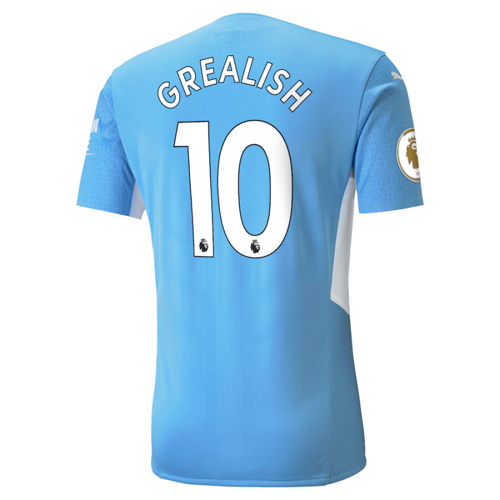 - تيشيرت مانشستر سيتي الرسمي موسم 2021/22 اسم ورقم غريليش 10 مع شعار الدوري بالذهبي